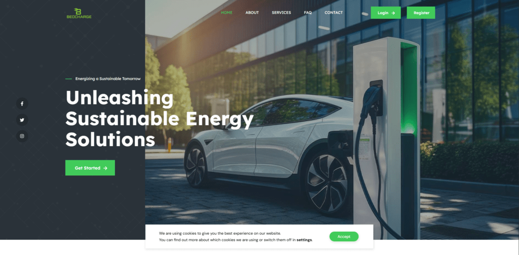 A high-quality EV charging visual immediately communicates BeoCharge’s mission and captures user attention.